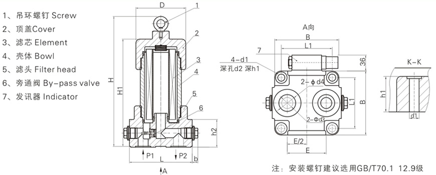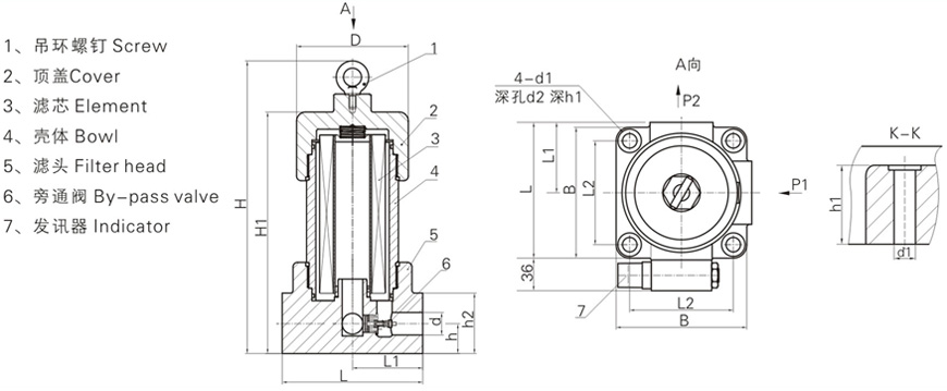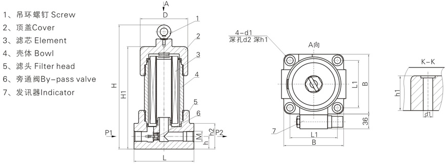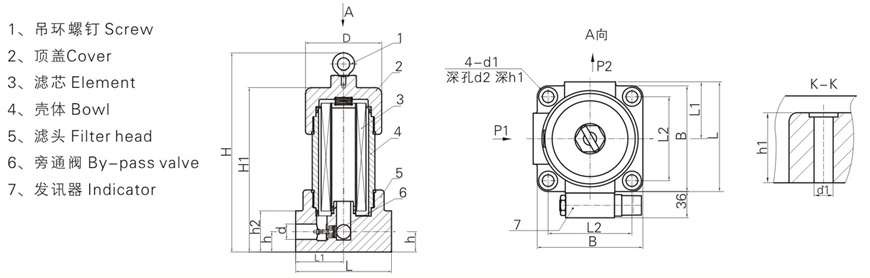 該過濾器設有壓差發訊裝置,當濾芯污染堵塞到進出油口壓差為0.35Mpa時,即發出開關信號,此時更換濾芯,以達到保護系統安全的目的。
