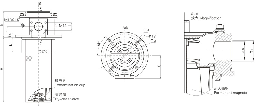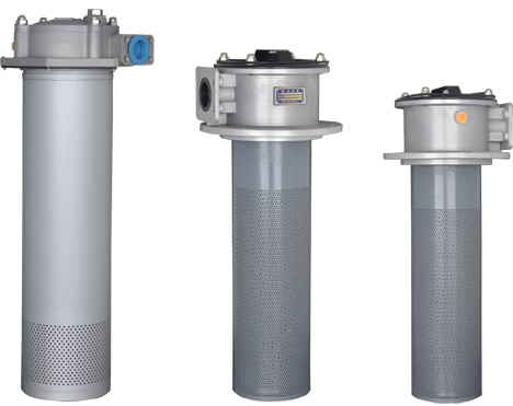 這種過濾器設(shè)有濾芯污染堵塞發(fā)訊器和油路旁通閥,當(dāng)回油壓力達到0.35MPa時,發(fā)訊器發(fā)出開關(guān)信號或報警,還可直接從發(fā)訊器的表盤上讀出回油壓力值,以提示操作人員及時更換濾芯,保證系統(tǒng)油液的清潔度。更換濾芯只需旋開過濾器端蓋即可。當(dāng)回油壓力上升至0.4MPa時,過濾器內(nèi)的旁通閥便自動卸荷,以避免回油壓力過高造成整個系統(tǒng)工作性能不良。
