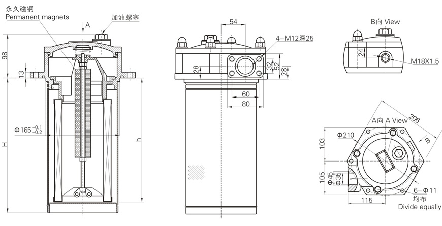 WY、GP系列磁性回油過濾器系列傳統(tǒng)型是我廠參考國外先進技術(shù)資料及廣大用戶的具體要求而特殊設(shè)計的新產(chǎn)品,這些過濾器僅一小部分的濾頭連接部分露在油箱外,其余大部分都在油箱內(nèi)部,從而簡化了系統(tǒng)管路,安裝方便,使系統(tǒng)排列緊湊美觀。在結(jié)構(gòu)上我們改進了原來管路回油過濾器的龐大結(jié)構(gòu),考慮到液壓系統(tǒng)內(nèi)產(chǎn)生量多的還是鐵磁性污染物,所以在回油精過濾前,先經(jīng)強磁鐵進行磁性過濾,然后再經(jīng)二級精密過濾。