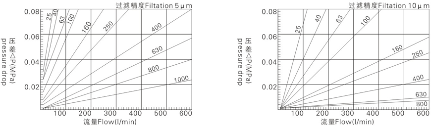 濾芯FAX-※ x ※ (由試驗測得數(shù)據(jù))Q-△P 曲線油液粘度