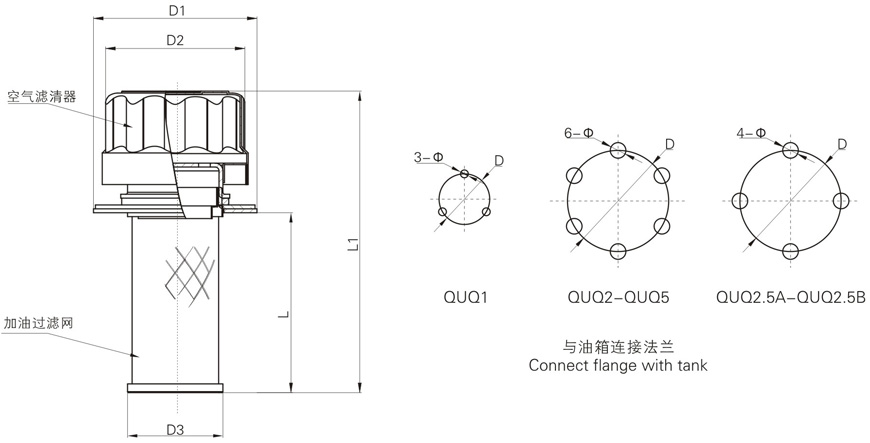 QUQ系列液壓空氣濾清器的設計參考了國外先進技術資料,并在批量生產EF系列液壓空氣濾清器的基礎上,進一步地改進后使空氣濾清器打到了標準化,系列化的目的。經使用表明,本產品具有體積輕巧,結構合理,外型設計美觀新穎,過濾性能穩定,安裝使用方便等優點,各項性能指標均達到了國外同類產品技術要求,連接尺寸與國外產品一致,并符合“液壓空氣濾清器國家標準和產品系列設計”技術要求,深得廣大用戶青睞。