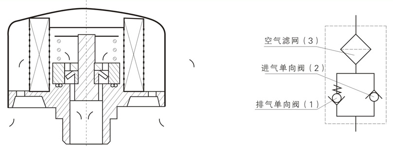 PAF系列產(chǎn)品適用于工程機(jī)械、車輛、移動(dòng)機(jī)械以及需要具有壓力的液壓系統(tǒng)油箱配套使用。本產(chǎn)品由空氣過濾器、進(jìn)氣單向閥、排氣單向閥、加油過濾器四部分組成,從而簡(jiǎn)化了油箱的結(jié)構(gòu),又有利于油液的凈化。當(dāng)液壓系統(tǒng)工作時(shí)油箱內(nèi)的液面不時(shí)上升或下降,下降時(shí)PAF產(chǎn)品吸入空氣,經(jīng)過濾網(wǎng)[3]自動(dòng)進(jìn)入進(jìn)氣單向閥[2],進(jìn)入油箱,此時(shí)箱內(nèi)壓力小于預(yù)定壓力,排氣單向閥[1]處于關(guān)閉狀態(tài),能保持油箱內(nèi)預(yù)定壓力,提高油泵的自吸能力,維持油箱內(nèi)液體的平穩(wěn),避免油箱內(nèi)液體因振蕩或騷動(dòng)而產(chǎn)生泵可能出現(xiàn)的吸空等故障。當(dāng)工作循環(huán)后流回油箱使液面上升,工作油液溫度也隨著升高,生成了油霧氣體并增加了油箱內(nèi)的壓力;當(dāng)油箱內(nèi)的壓力大于預(yù)定壓力時(shí),排氣單向閥[1]自動(dòng)開啟向外排氣,直到箱內(nèi)壓力等于預(yù)定壓力時(shí),排氣單向閥[1]才自動(dòng)關(guān)閉。這樣來回循環(huán)既能保護(hù)液壓系統(tǒng)正常工作的作用,又能延長(zhǎng)油液及元件周期和使用壽命。