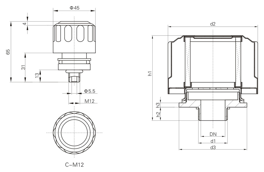 公稱通徑 | d1 | d2 | d3 | h1 | h2 | h3 | 空氣流量(m3/min) | ||